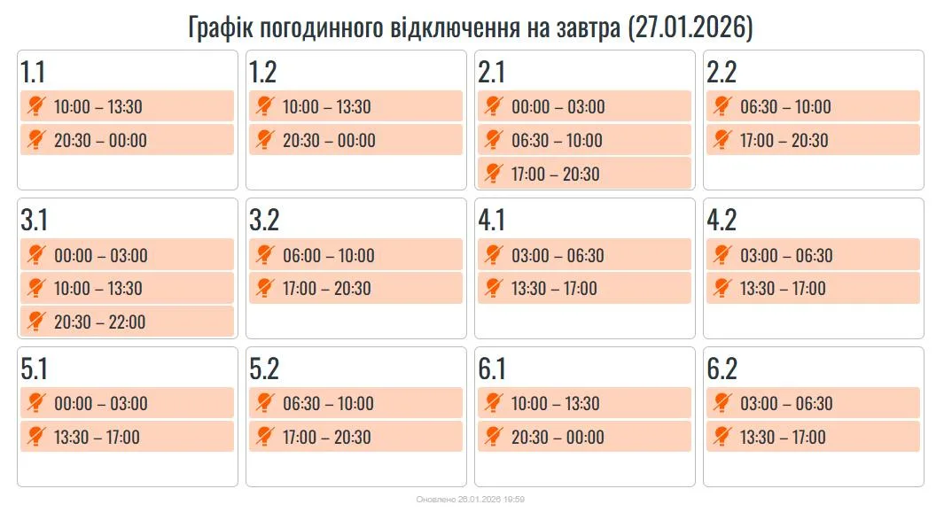 Завтра, 27 січня, в усіх регіонах України, в тому числі на Прикарпатті, будуть застосовуватися графіки погодинних вимкнень. Причина запровадження заходів обмеження – наслідки ворожих російських ракетно-дронових атак на енергооб’єкти.