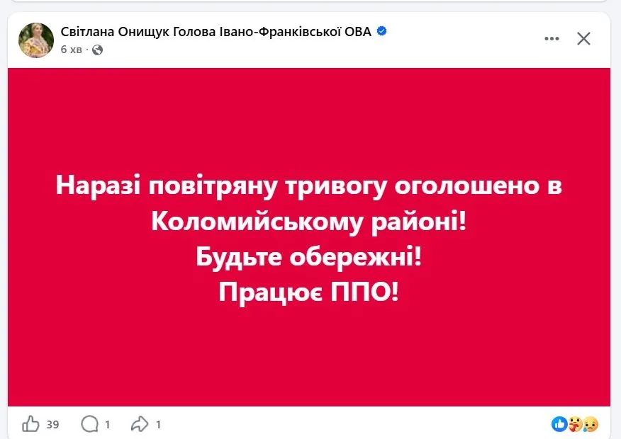За інформацією голови Івано-Франківської ОВА Світлани Онищук, працює протиповітряна оборона.
