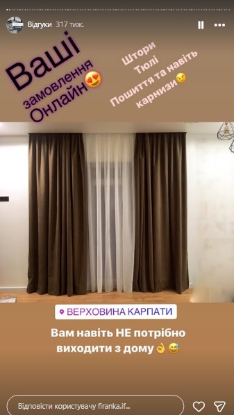 На сторінці бренду в Instagram Фіранка штори та карнизи Івано-Франківськ представлено численні приклади втілених проєктів: від класичних інтер’єрів до сучасного мінімалізму, від затишних спалень до функціональних кухонь. Фотографії робіт демонструють високу якість пошиття, продумані драпірування та використання різноманітних типів тканин.