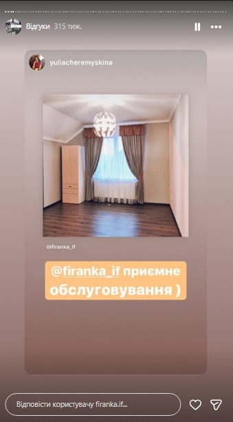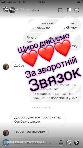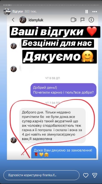 «Тільки нещодавно встановили, бо не були вдома. Все супер! Карниз такий акуратний, що навіть чоловіку сподобався. Тюль теж чудова — я її випрала та склала, і вона за чотири дні навіть не зім’ялася. Дякую вам, я дуже задоволена», — додає інша клієнтка