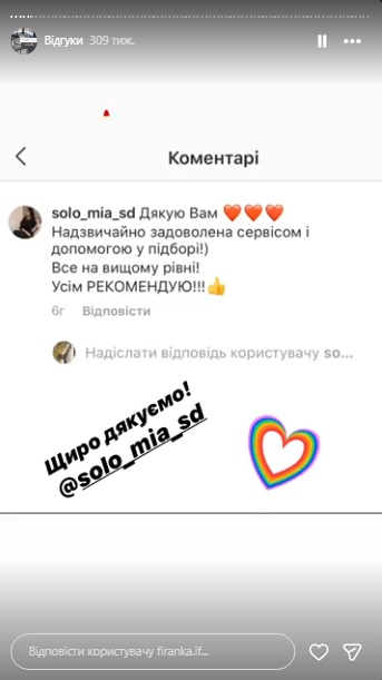 «Якість на найвищому рівні, і підхід до клієнта — з повагою. Професійна команда — це великий плюс. Пошиття бездоганне», — зазначає одна із замовниць.