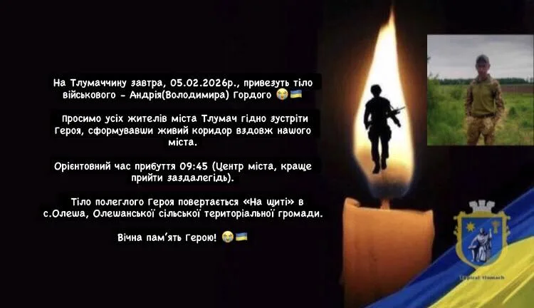 На Тлумаччину у четвер 05.02.2026р., привезуть тіло військового – Андрія (Володимира) Гордого. Просимо усіх жителів міста Тлумач гідно зустріти Героя, сформувавши живий коридор вздовж нашого міста, повідомляє у спільноті Типовий Тлумач Петро Пісак.