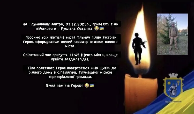 Далі похоронний кортеж прямуватиме з міста Тлумача у село Палагичі до рідної домівки померлого захисника, пише Тлумацька міська рада.
