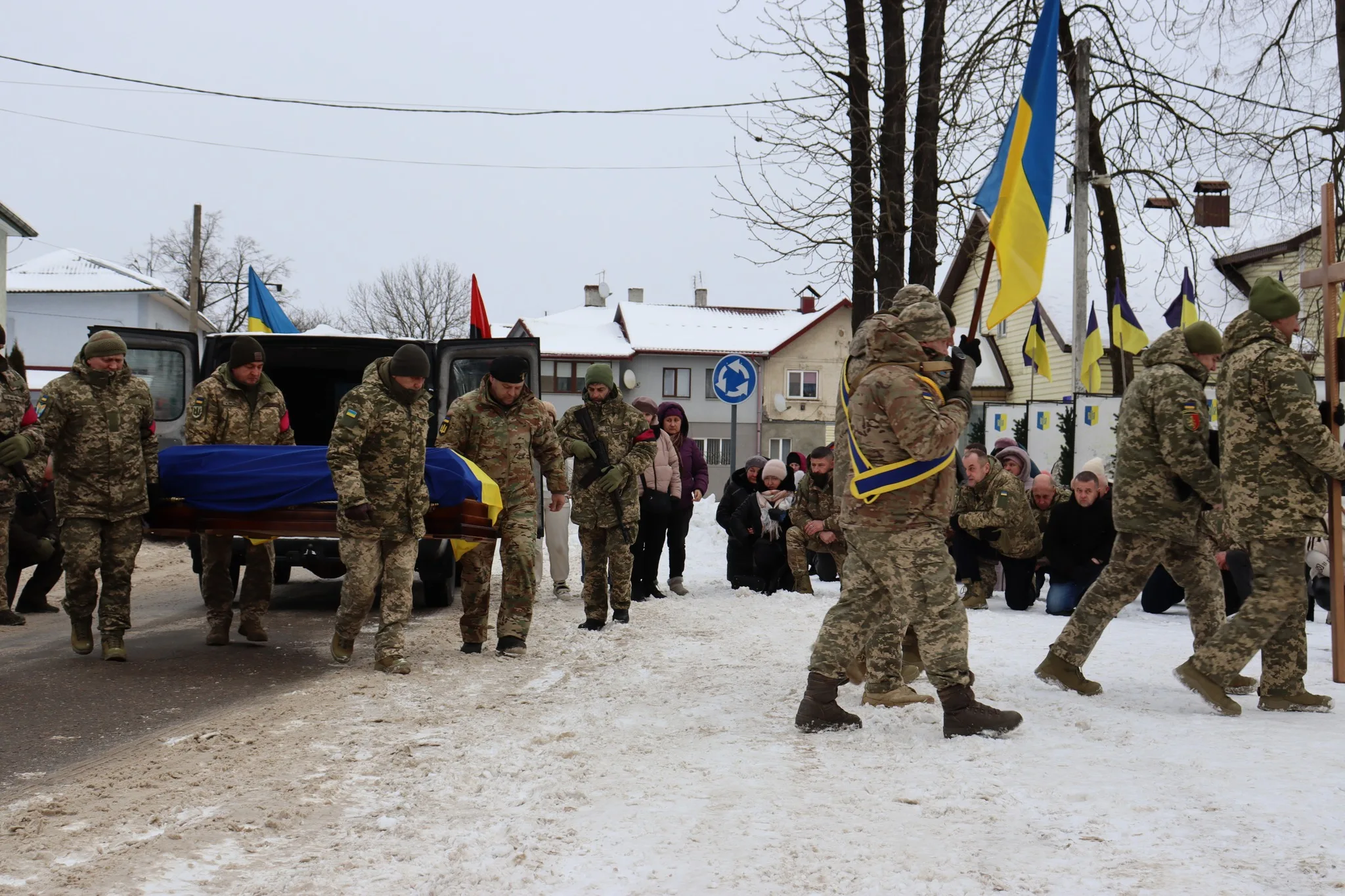 Мешканці громади створили живий коридор шани, ставши вздовж дороги, аби віддати останню шану Герою, який самовіддано став на захист Батьківщини та віддав своє життя за мир і свободу українського народу.