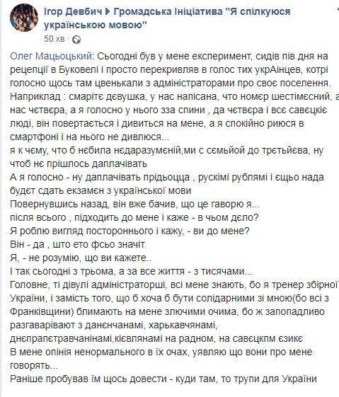 Тренер та гірськолижник Олег Мацьоцький обурився ситуацією з українською мовою на курорті Буковель.
