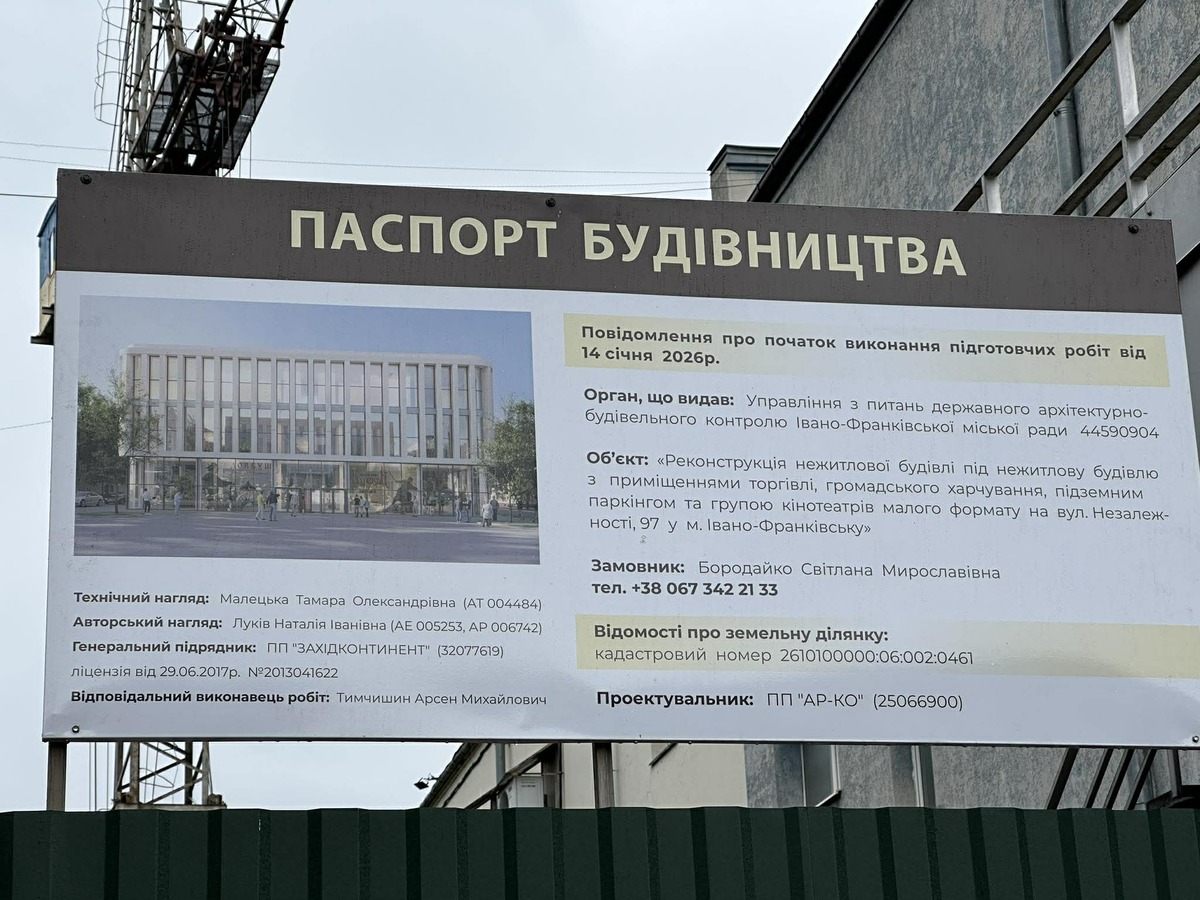 Офіційна назва об’єкта — «Реконструкція нежитлової будівлі під нежитлову будівлю з приміщеннями торгівлі, громадського харчування, підземним паркінгом та групою кінотеатрів малого формату на вул. Незалежності, 97 у м. Івано-Франківську». Замовницею робіт вказана Бородайко Світлана Мирославівна. Проєктувальником є ПП «АР-КО». Генеральним підрядником визначене ПП «ЗАХІДКОНТИНЕНТ», а відповідальним виконавцем робіт — Орест Тимчишин.