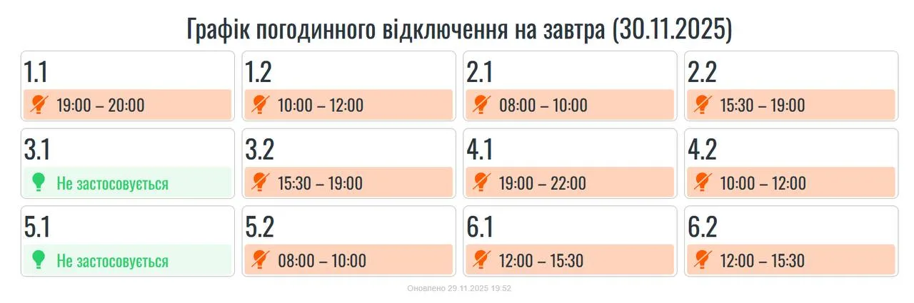 Завтра, 30 листопада, на території Івано-Франківської області будуть застосовані графіки погодинних вимкнень. Причина запровадження обмежень – наслідки масованих російських ракетно-дронових атак на енергооб’єкти