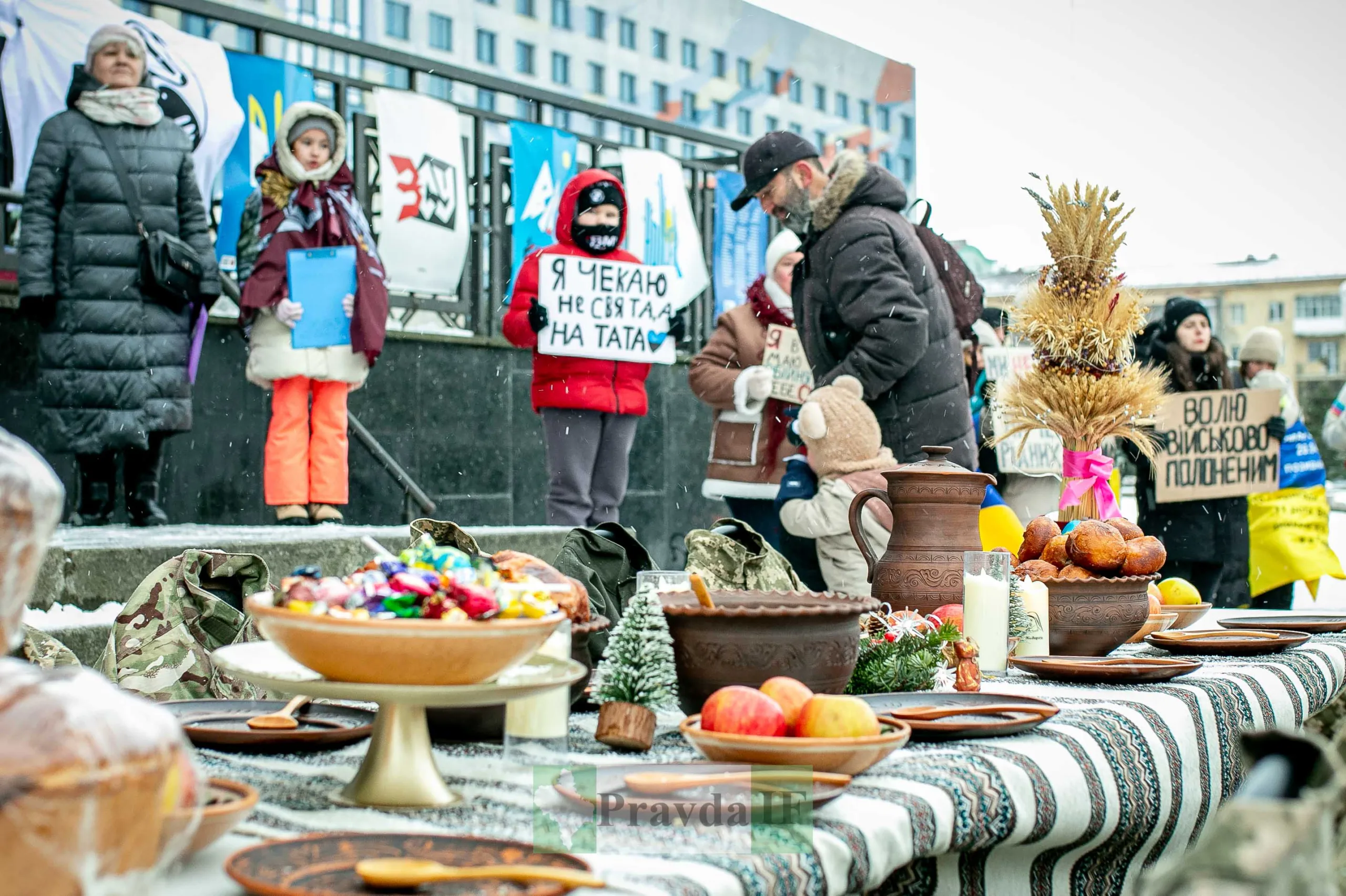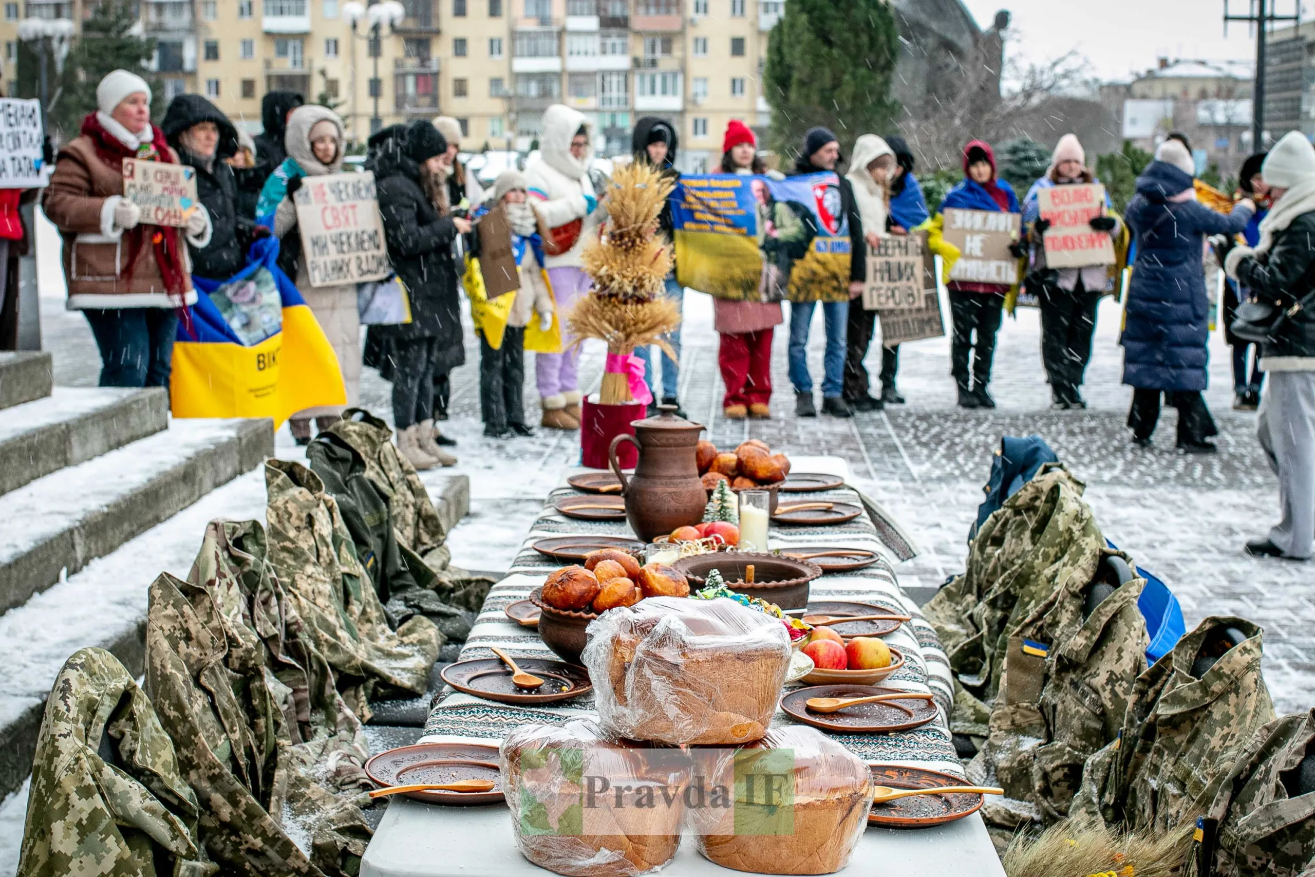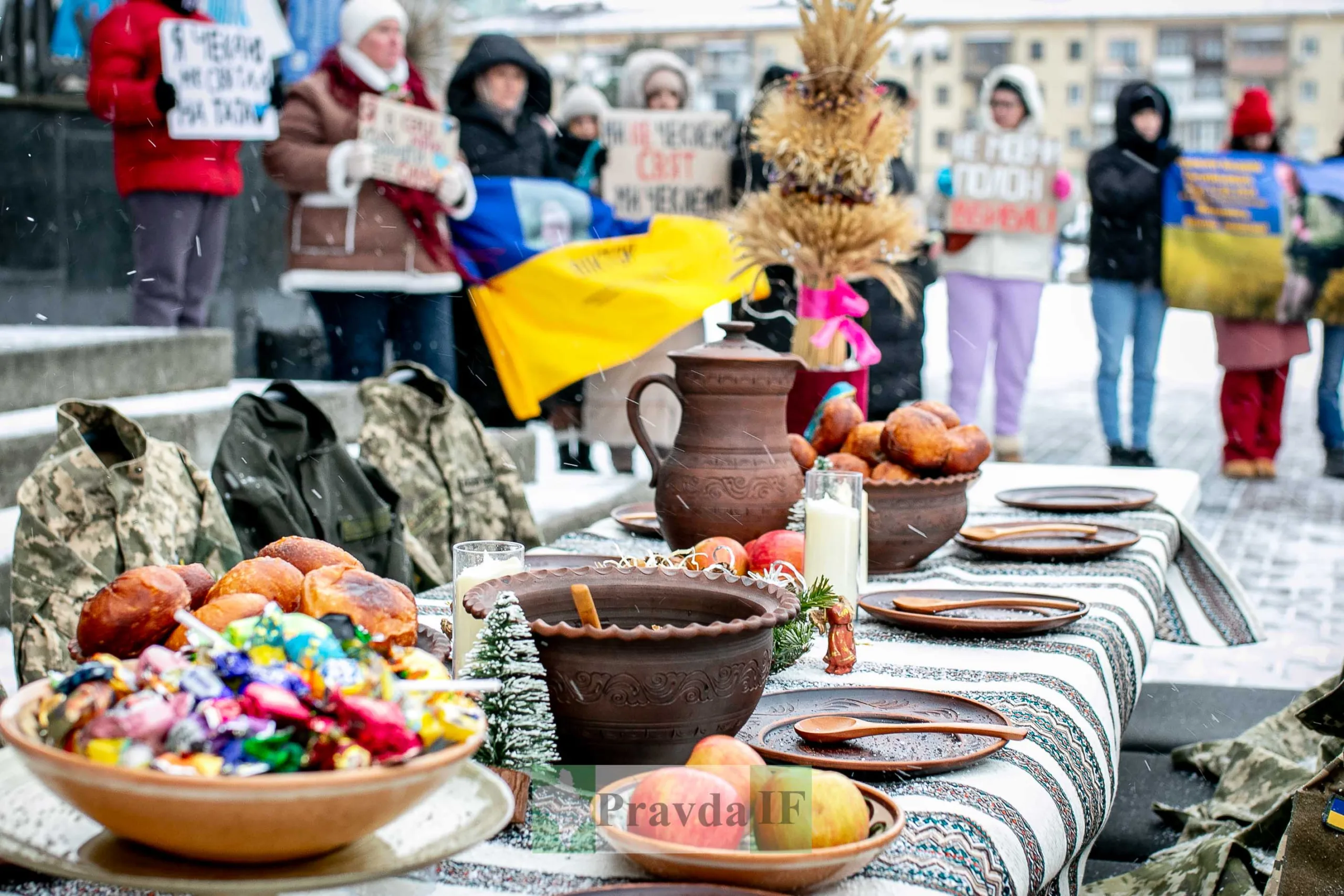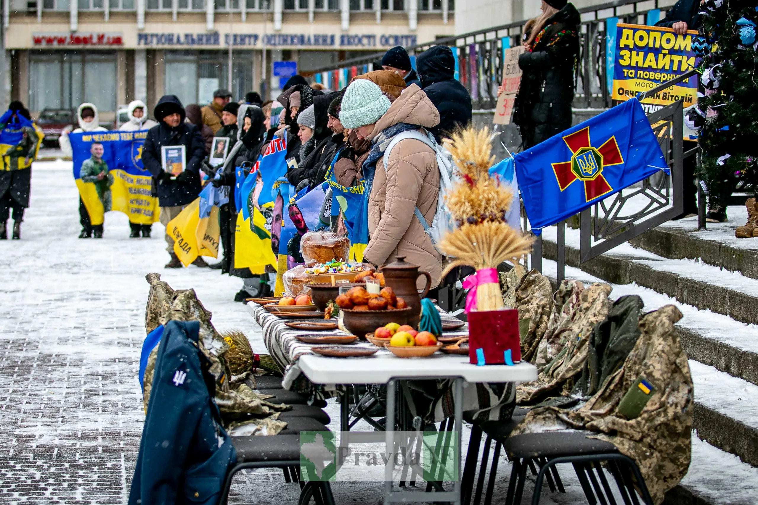 Для військовий накрили імпровізований різдвяний стіл, як нагадування, що їх чекають вдома. Також присутні тримали в руках плакати та прапори.
