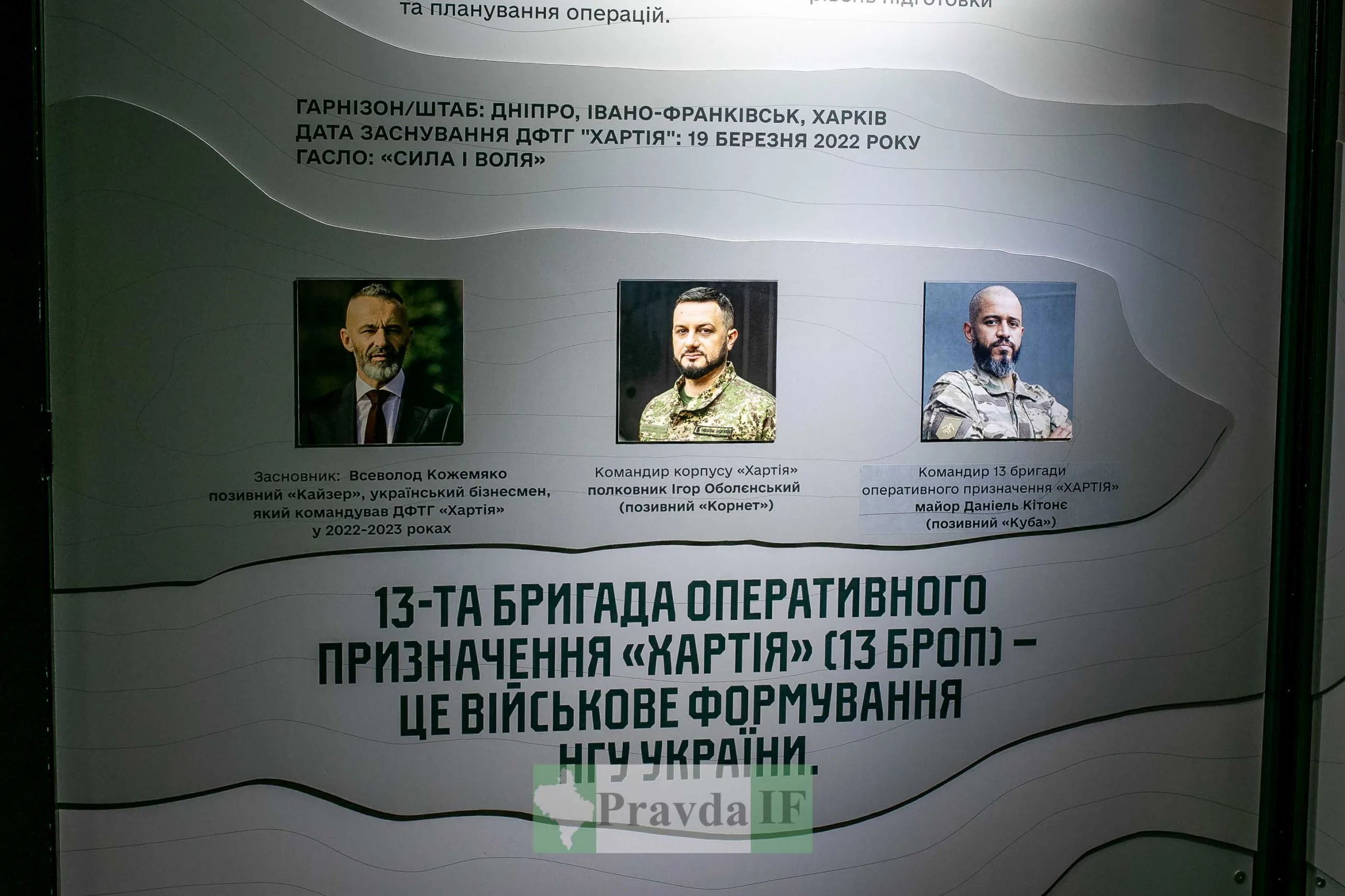 В Івано-Франківську відкрилася інтерактивна виставка, присвячена 13-й бригаді оперативного призначення Національної гвардії України “Хартія”. Експозиція розповідає про сучасне українське військо через поєднання технологій, бойового досвіду та особистих історій захисників.