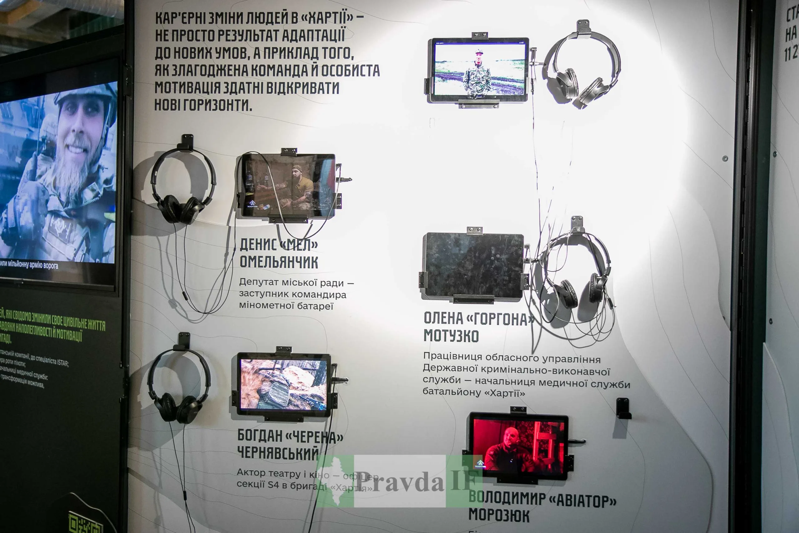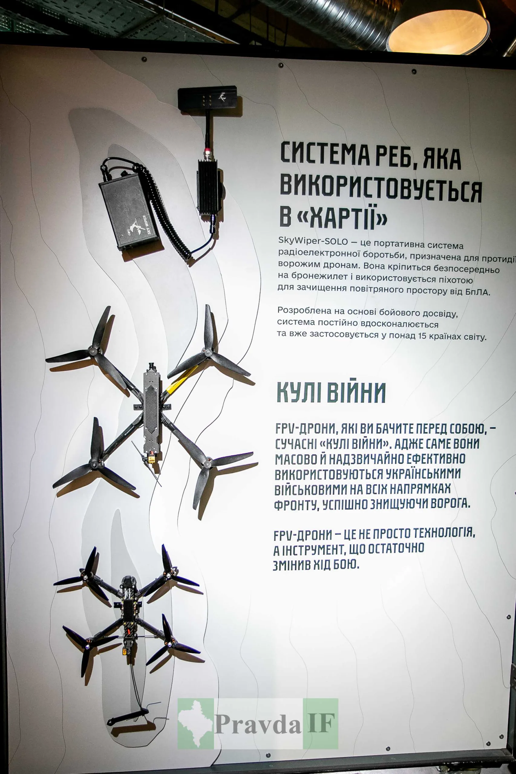 На виставці представлені макети сучасних військових технологій, зокрема камікадзе-дронів, засобів радіоелектронної боротьби та робопса, який використовується для виконання бойових завдань. Також можна ознайомитися з інтерактивною мапою України, де позначено райони бойових дій бригади «Хартія», прослухати гімн підрозділу, інтерв’ю військових та переглянути відео з бойових виходів.