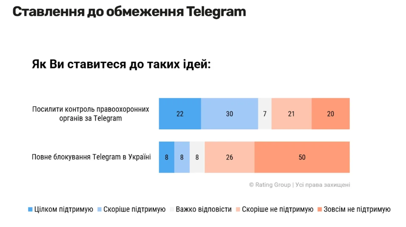 На початку березня соціологічна група «Рейтинг» оприлюднила результати цікавого дослідження щодо ставлення українців до ймовірного блокування «Телеграму». Згідно з результатами опитування, 76% респондентів виступають проти повного блокування «Телеграму» в Україні, 16% таку ідею схвалюють. Натомість більше половини опитаних – 52% – підтримують посилення нагляду за месенджером з боку правоохоронних органів, а 41% – проти цього.