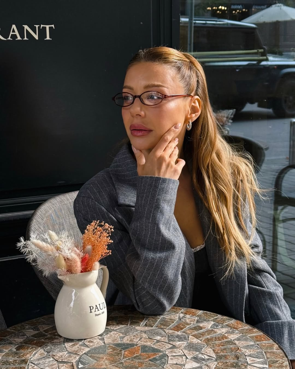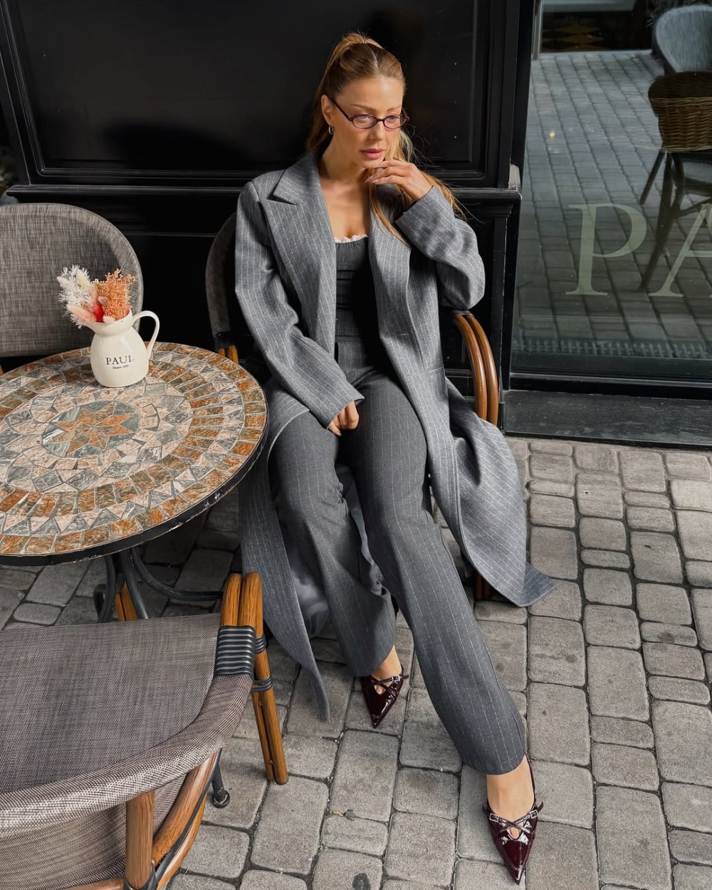 Перед камерою постала у силуетному костюмі сірого кольору та довгому пальті в смужку. Образ доповнила зібраним волоссям, нюдовим макіяжем, бордовими туфлями й окулярами з акцентною оправою