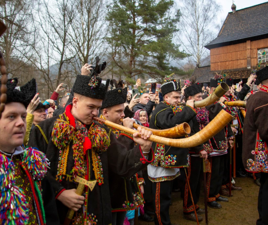 Гуцульська коляда біля церкви Різдва Пресвятої Богородиці в селі Криворівня. Тут відчувається справжній дух різдвяних традицій. А звуки трембіт, скрипок і дзвіночків занурюють у містичну атмосферу Карпат.
