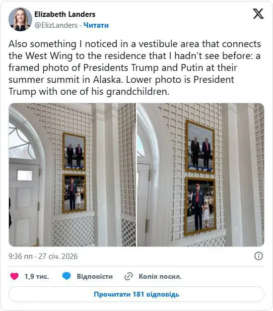 “Також я помітила у вестибюлі, що з’єднує західне крило з резиденцією, те, чого раніше не бачила: фотографію в рамці, на якій зображені президенти Трамп і Путін на літньому саміті в Алясці”, – написала Ландерс.