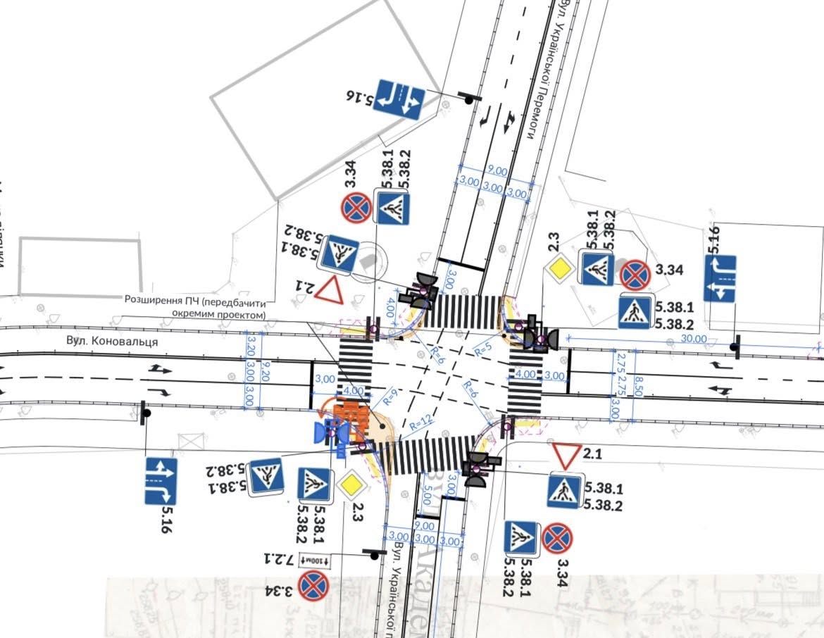 • з вул. Є. Коновальця праворуч на вул. Січових стрільців можуть їхати лише автобуси (так-звана контрсмуга громадського транспорту);