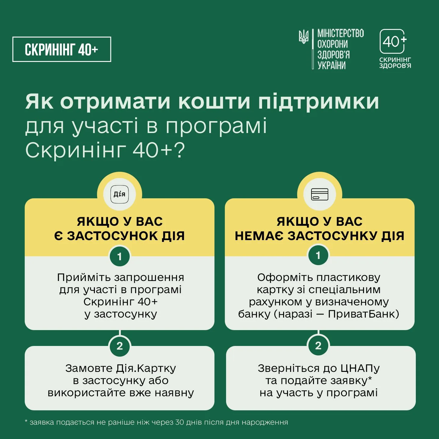 Якщо ви не користуєтесь застосунком Дія, то зможете оформити спеціальну банківську картку та подати заявку через ЦНАП за тридцять днів після дня народження.