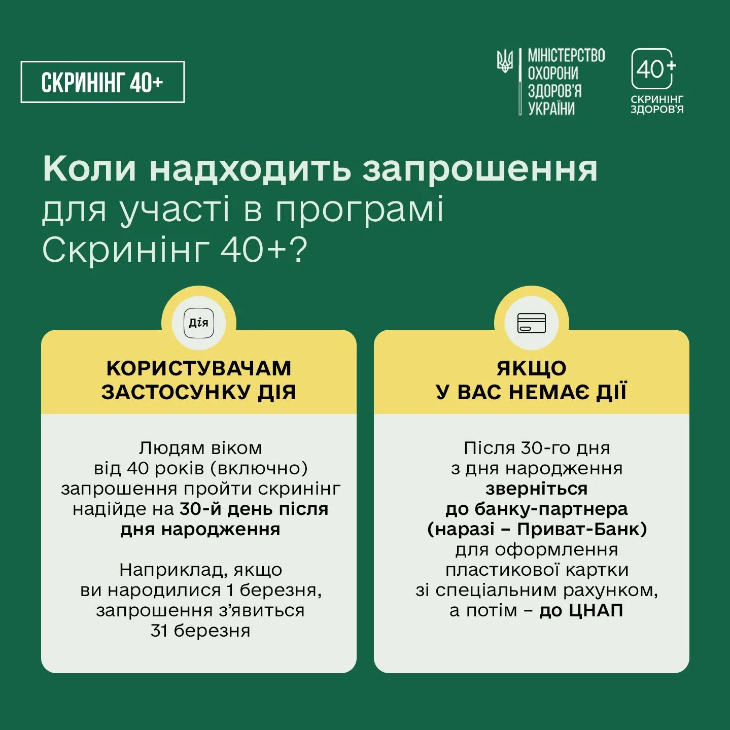 Запрошення на скринінг почнуть надходити в застосунку Дія на 30-й день після дня народження — для людей віком 40+. Тобто, якщо вам уже є 40 років чи більше і, до прикладу, ваш день народження сьогодні — 1 січня — то своє запрошення ви отримаєте 31 січня.