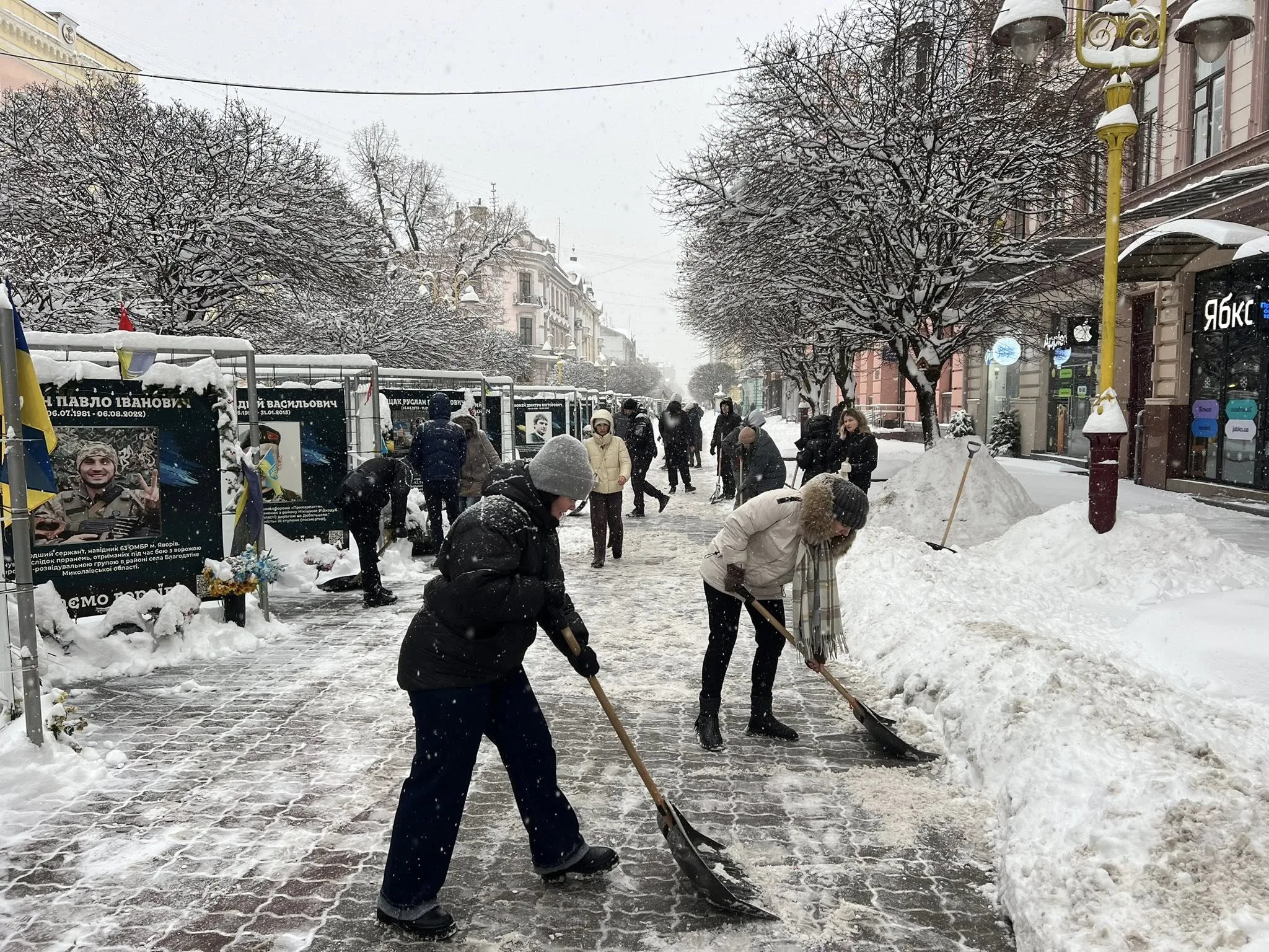 Після хвилини мовчання о 09:15 чиновники та їхні підрозділи долучилися до комунальників у розчищенні вулиць і тротуарів, пише Правда.