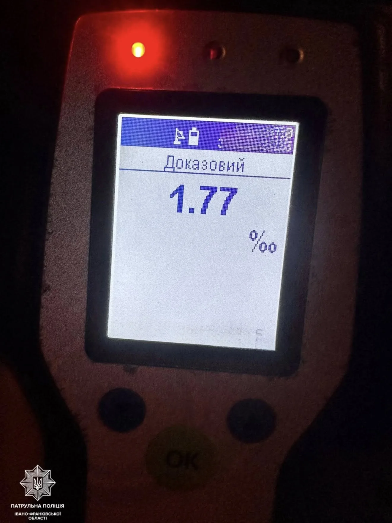 Під час спілкування з 32-річною водійкою Peugeot, поліцейські інспектори виявили ознаки алкогольного сп’яніння. Освідування підтвердило — у її крові 1.77 проміле алкоголю.