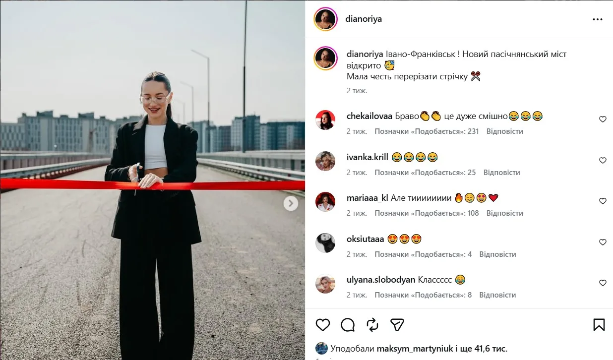 Так, користувачка соціальної мережі Instagram із нікнеймом dianoriya виклала но своїй особистій сторіці невелику фотосесію, де вона із друзями урочисто перерізає червону стрічку на пасічнянському мості-довгобуді, а потім вони усі разом весело святкують цю непересічну для міста Івано-Франківська подію.