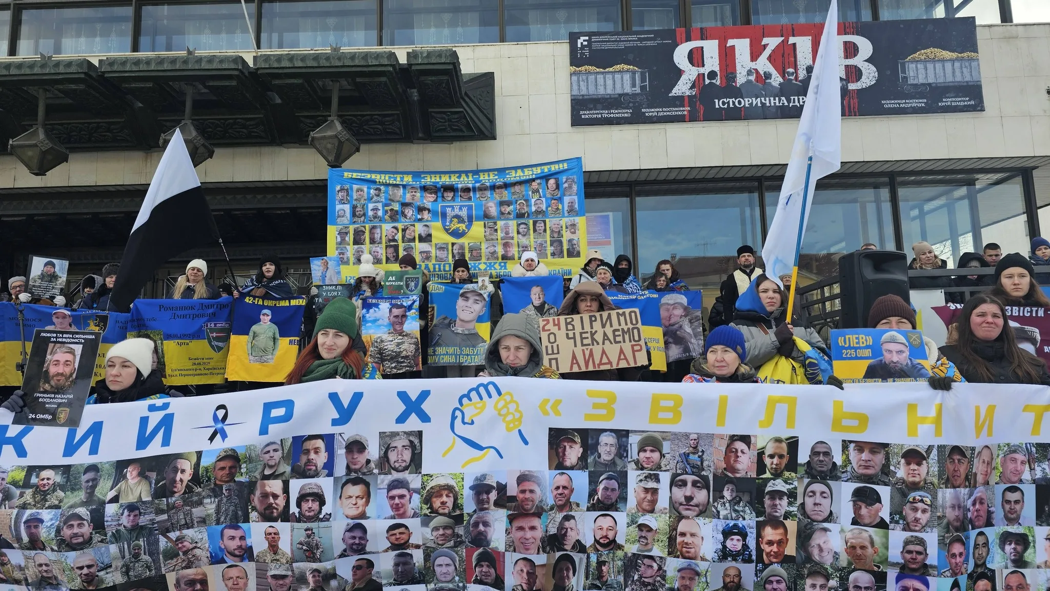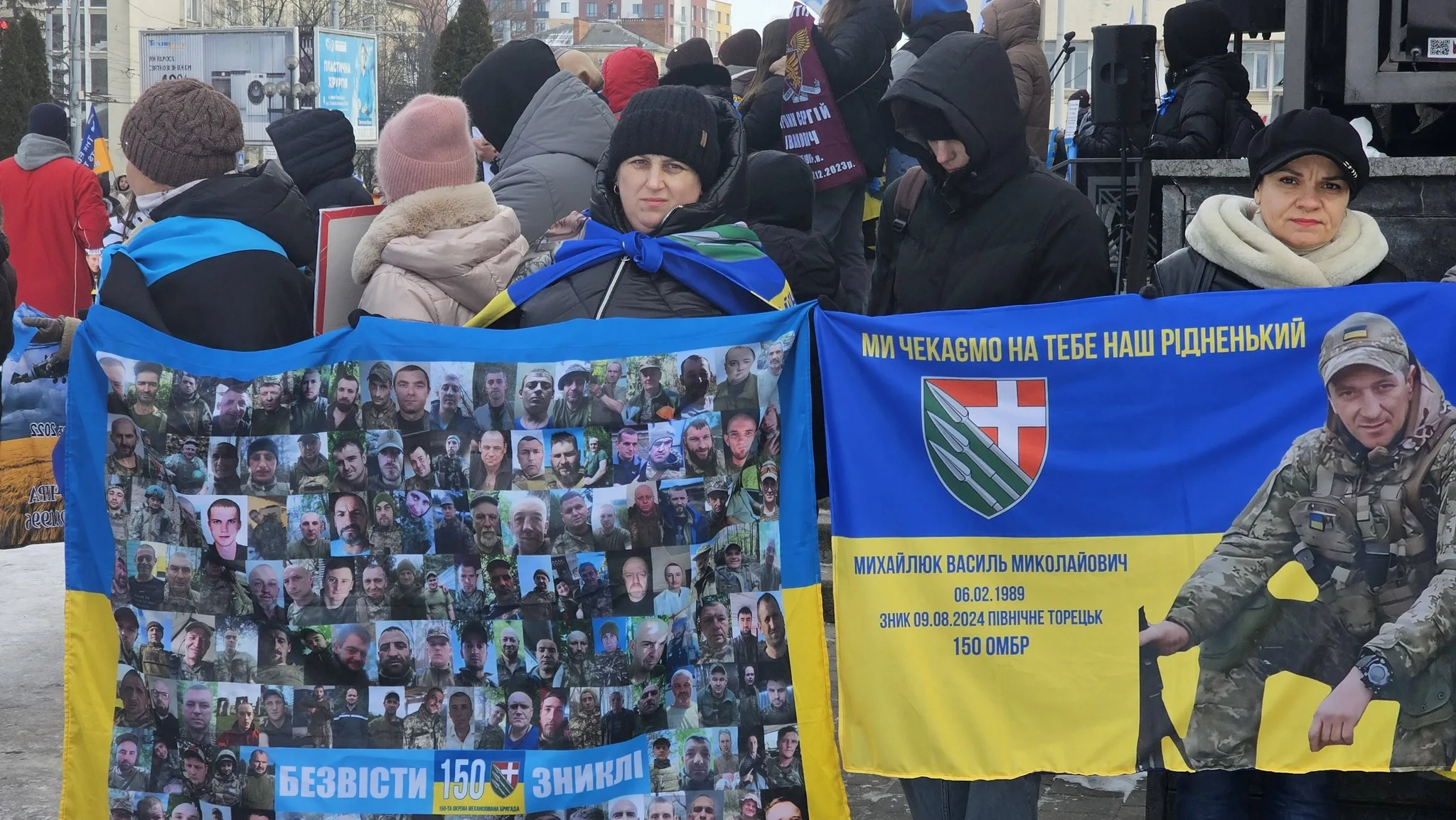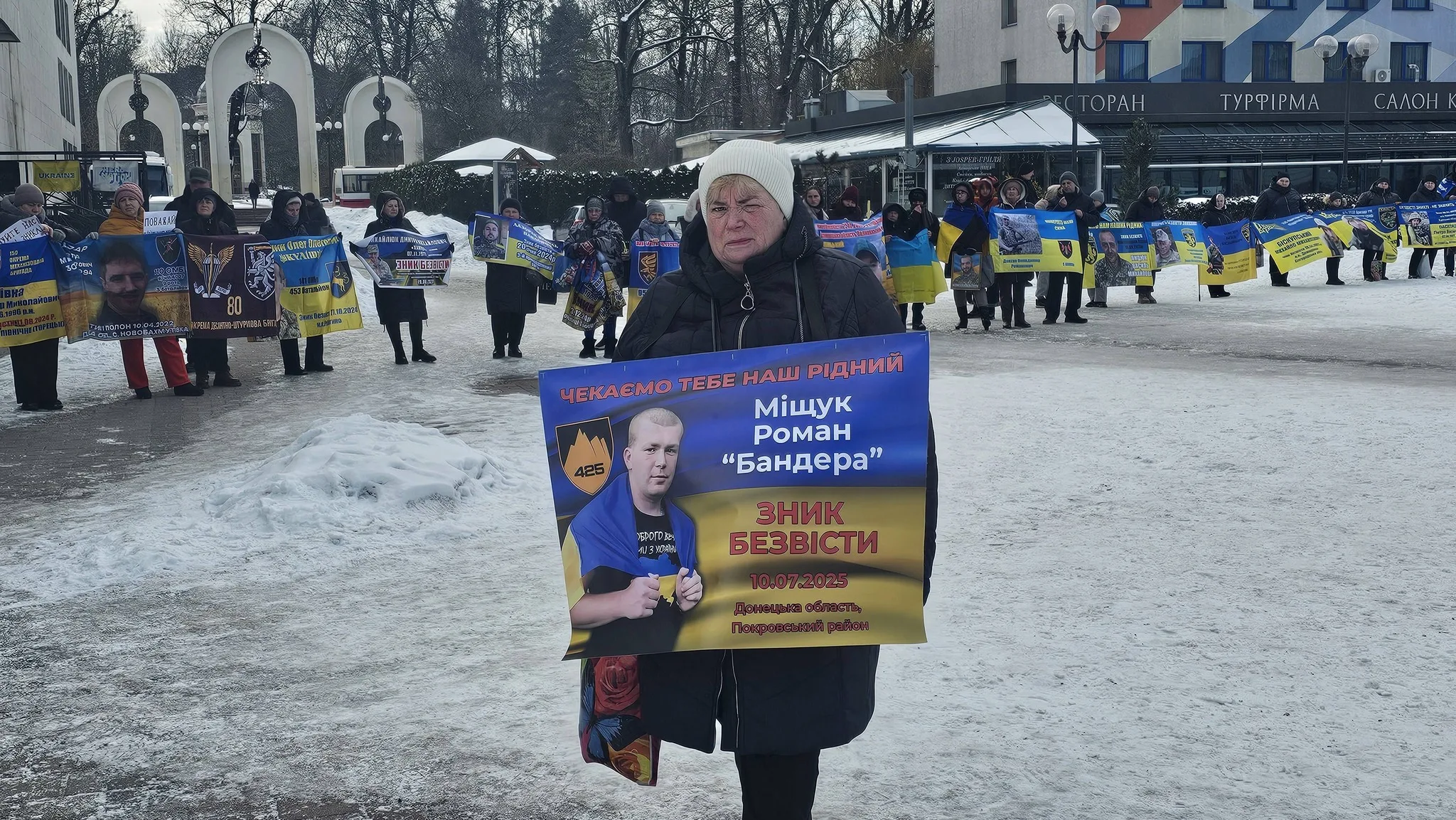 Учасники акції тримали плакати та синьо-жовті прапори із зображеннями зниклих та військовополонених воїнів із написами: