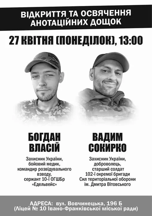У понеділок, 27 квітня, в Івано-Франківську відбудеться відкриття анотаційних дощок полеглим українським воїнам — Богдану Власію та Вадиму Сокирку, які віддали свої життя за Україну.