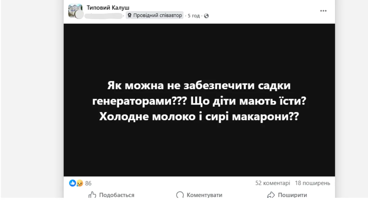 У міській раді цю інформацію спростовують. Кажуть, що дитячі садочки забезпечені генераторами, хоча їхньої потужності справді не є достатньо для повноцінної роботи харчоблоків. Щоб вийти з ситуації, кухарі ще звечора і навіть у нічний час роблять максимально можливі затоговки для того, щоб на ранок все можна було приготувати і діти були ситі.