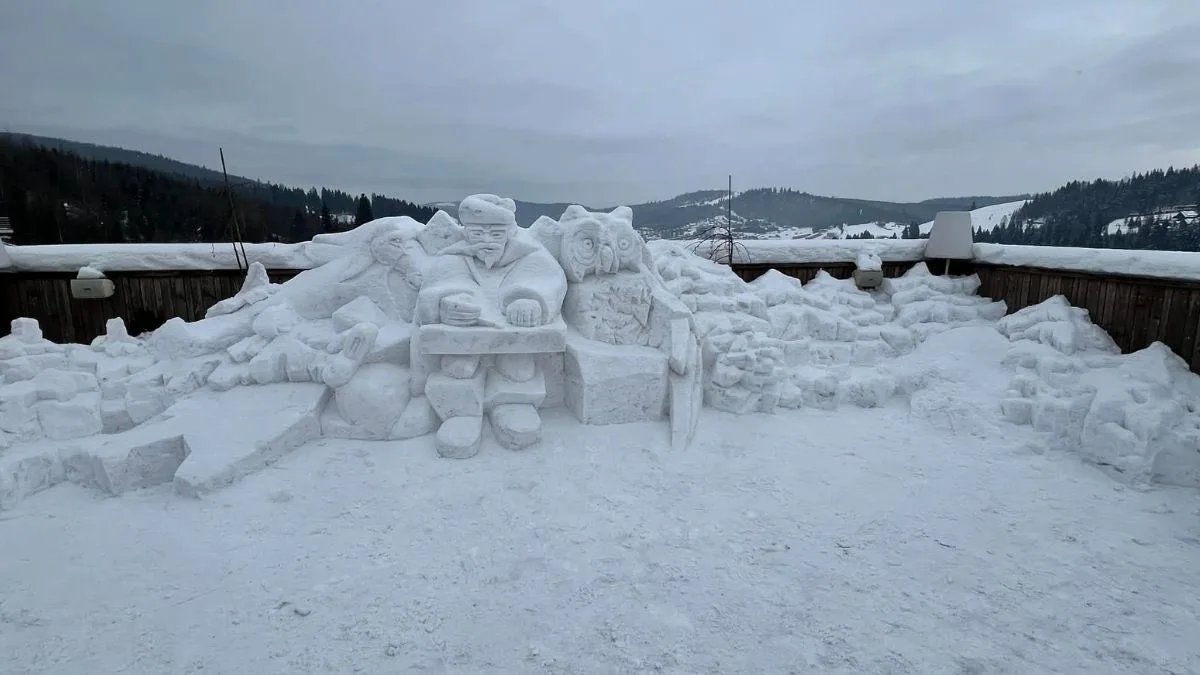 На терасі одного з парк-готелів, на рівні сьомого поверху, митці перетворили звичайний гірський сніг на масштабну художню композицію. Центральним образом став гуцул-музикант, який грає на цимбалах. Скульптура символізує Карпати, силу традицій та незламність українського духу. Її розміри вражають — близько двох метрів заввишки та семи метрів завширшки, пише Управління культури, національностей та релігій Івано-Франківської ОДА.