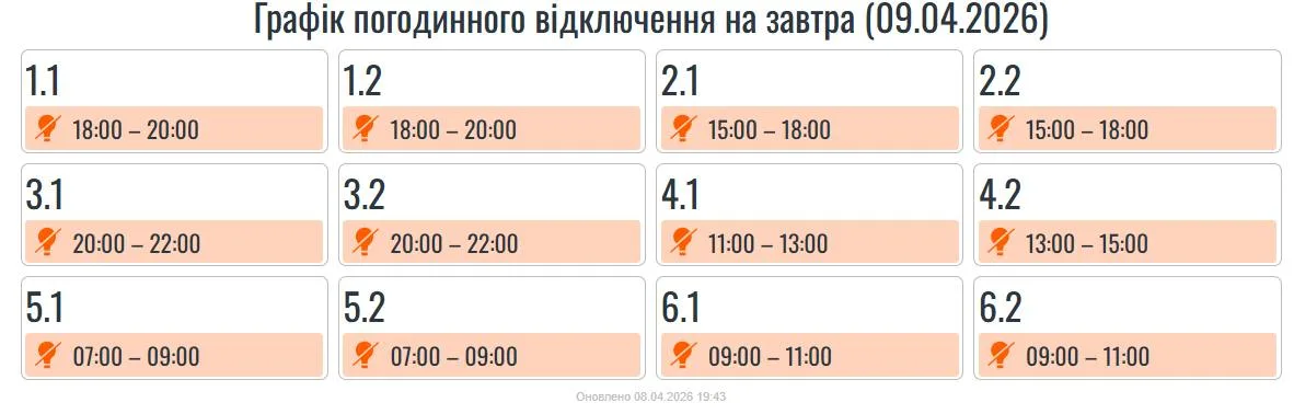 Завтра, 9 квітня, в усіх регіонах України, в тому числі на Прикарпатті, будуть застосовуватися графіки погодинних вимкнень з 07:00 до 22:00.