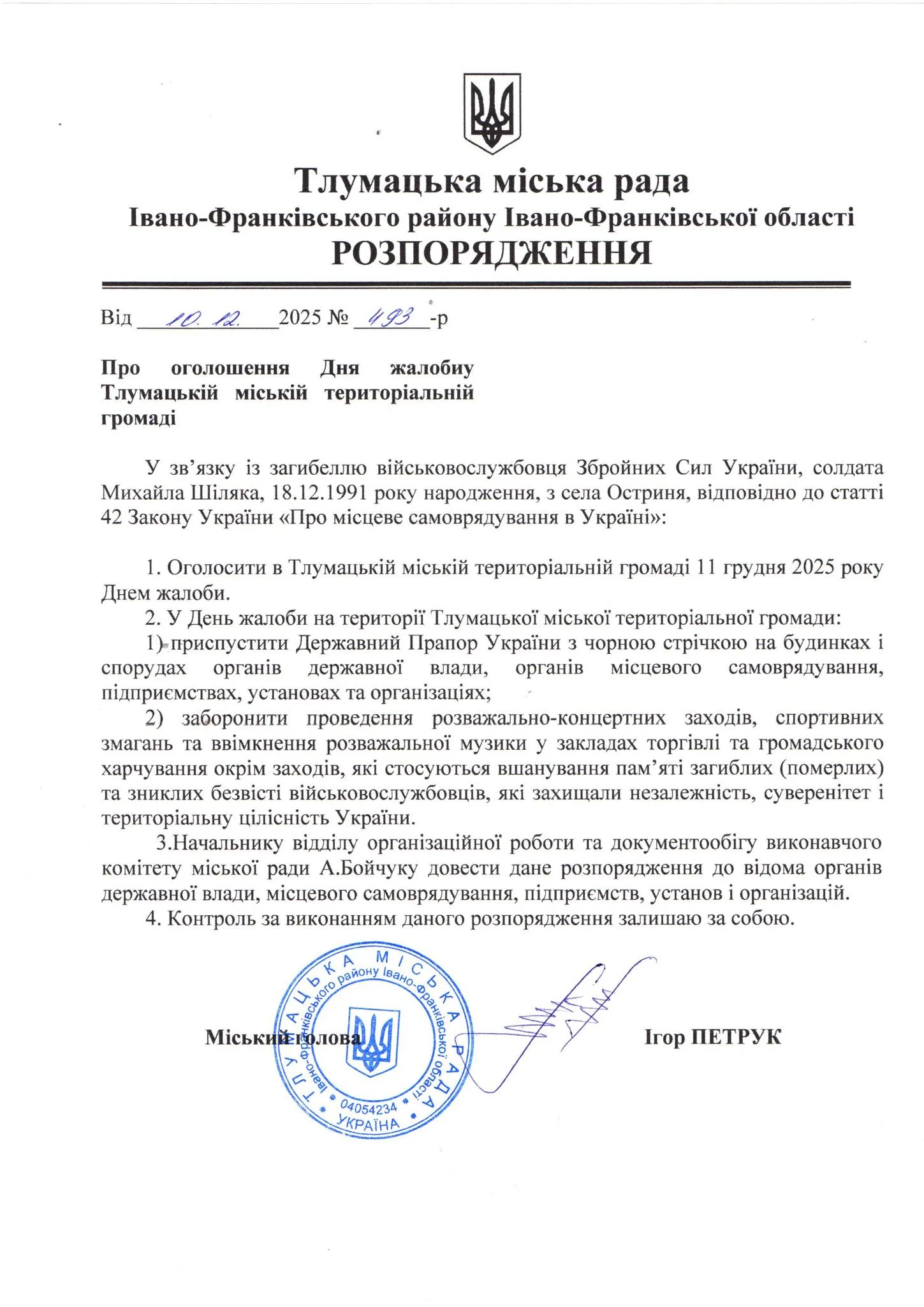 11 грудня 2025 року у Тлумацькій громаді оголошено днем жалоби за загиблим військовослужбовцем Михайлом Шіляком.