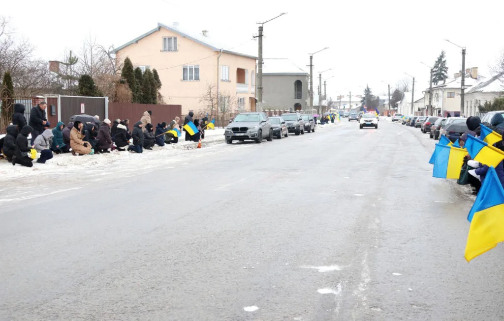 Громадяни вшанували пам’ять захисників живим ланцюгом на колінах під час зустрічі кортежів пише Тисменицька міська рада.