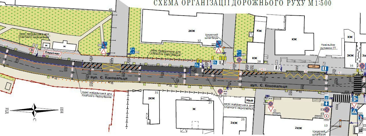 - вул. Коновальця (від Січових Стрільців до Сахарова) — 38 місць, з них 4 місця для осіб з інвалідністю