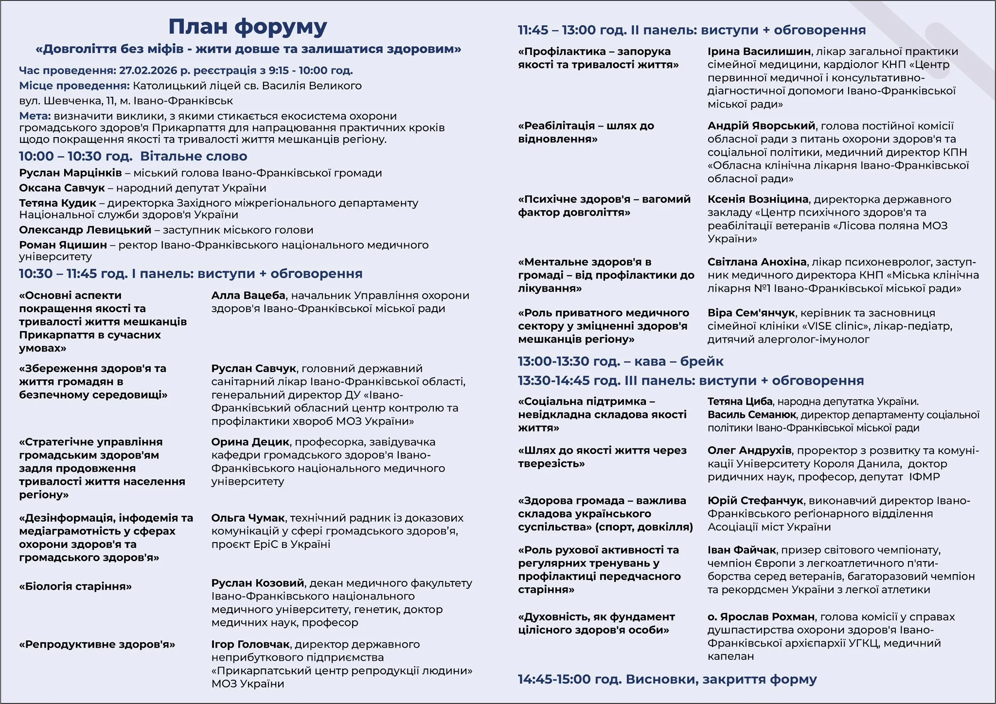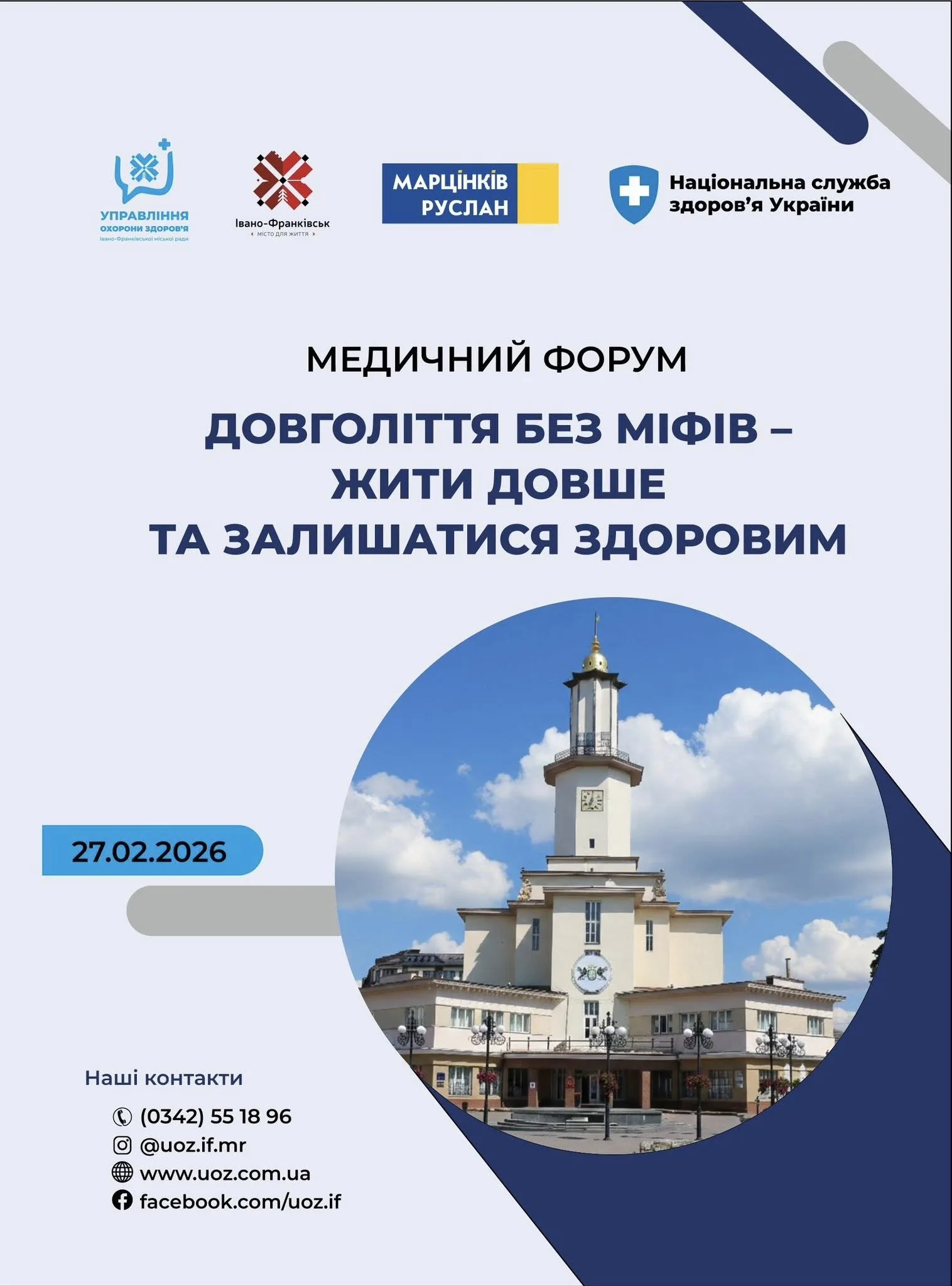 У п’ятницю, 27 лютого, відбудеться медичний форум «Довголіття без міфів – жити довше та залишатися здоровим», який об’єднає провідних лікарів, науковців, фахівців із громадського здоров’я, управлінців, а також представників органів державної влади та місцевого самоврядування.