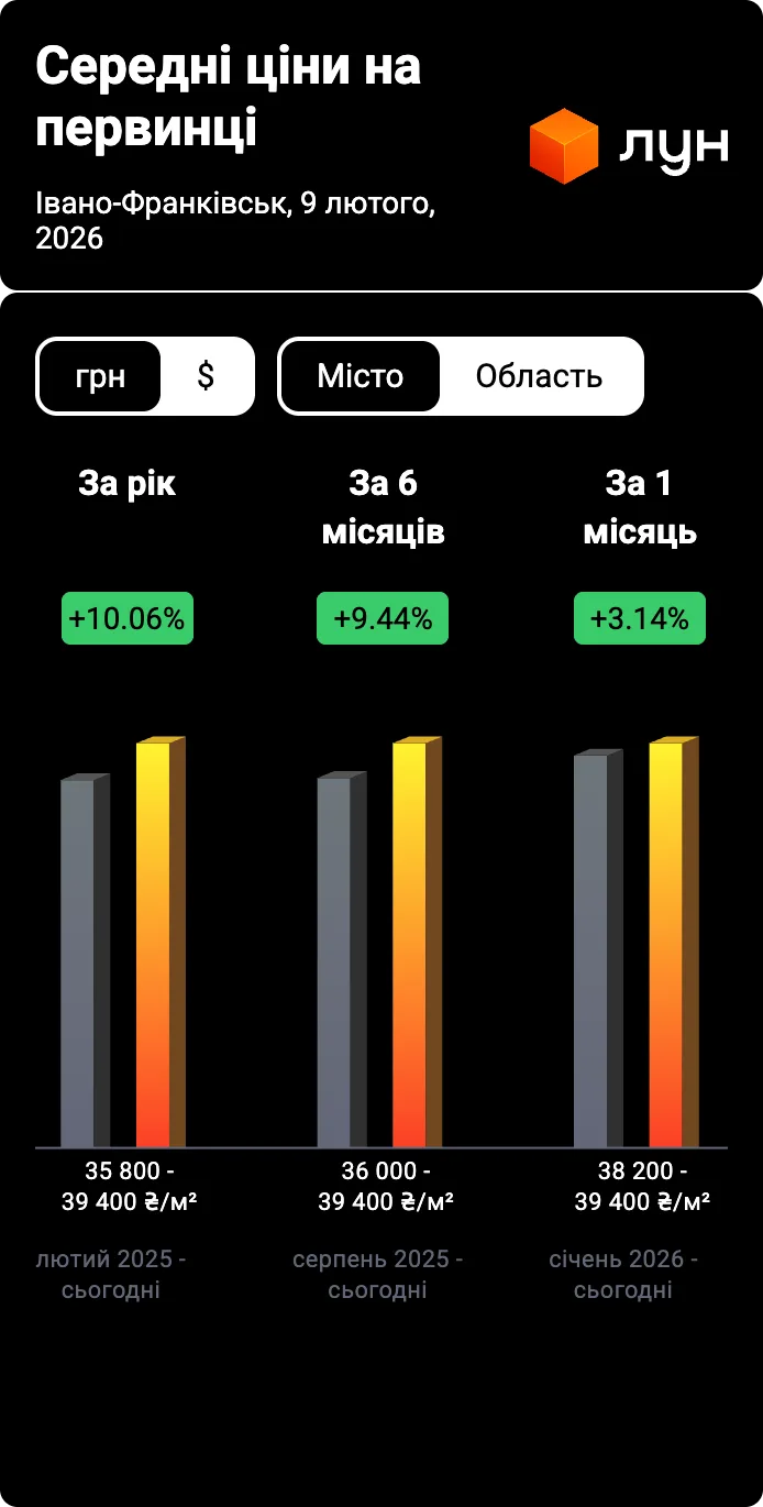 Станом на початок 2026 року середня ціна квадратного метра в новобудовах Івано-Франківська становить близько 39 400 грн/м².