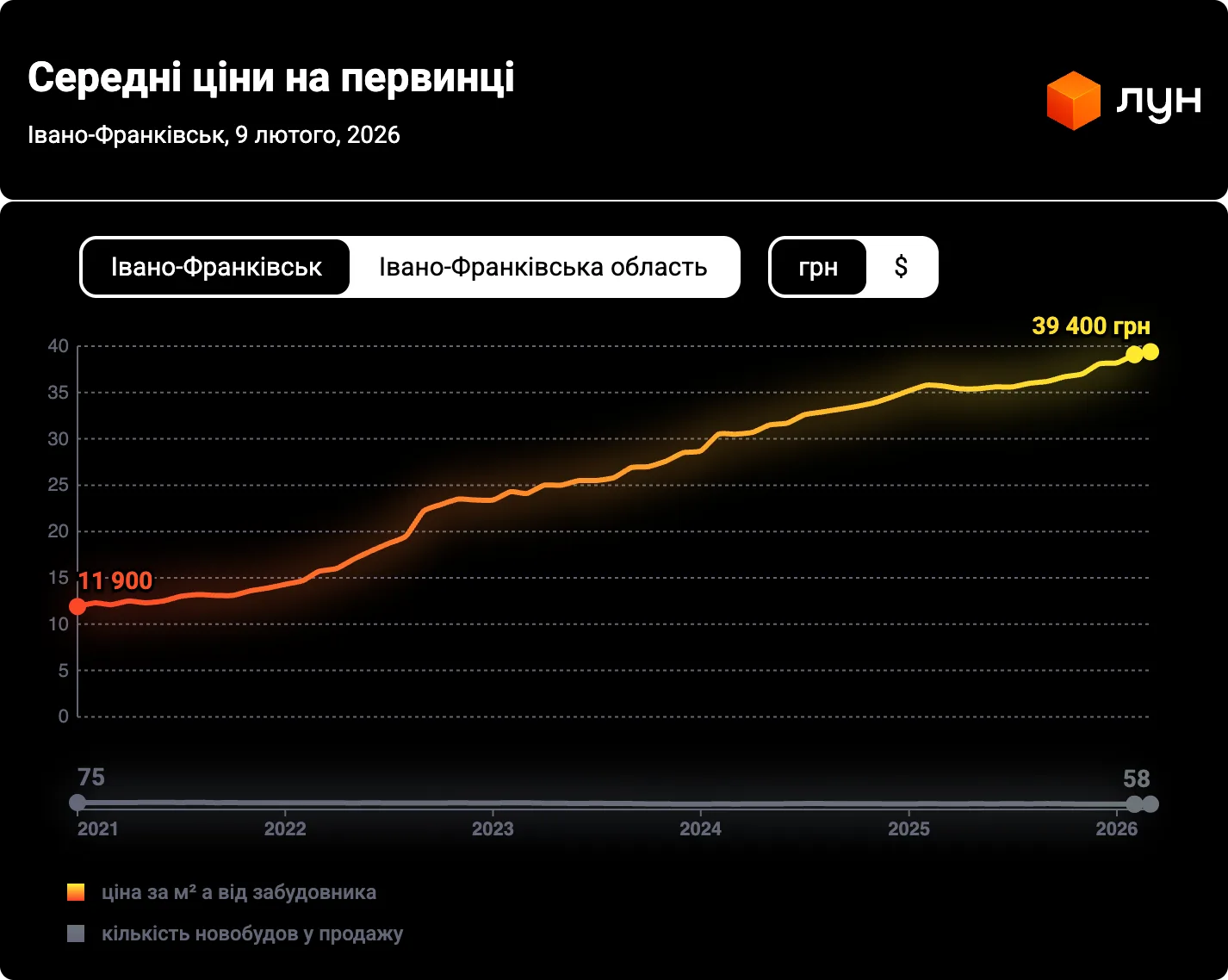 Довгострокова динаміка показує стале зростання цін на первинному ринку. За даними ЛУН, з 2021 року середня ціна квадратного метра в новобудовах Івано-Франківська зросла з близько 11 900 грн/м² до 39 400 грн/м² на початку 2026 року.