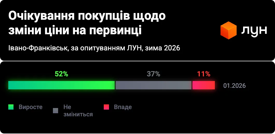 Очікування покупців на первинному ринку залишаються переважно позитивними. За результатами опитування ЛУН, проведеного взимку 2026 року, 52% респондентів очікують зростання цін, 37% вважають, що вони не зміняться, і 11% припускають зниження.