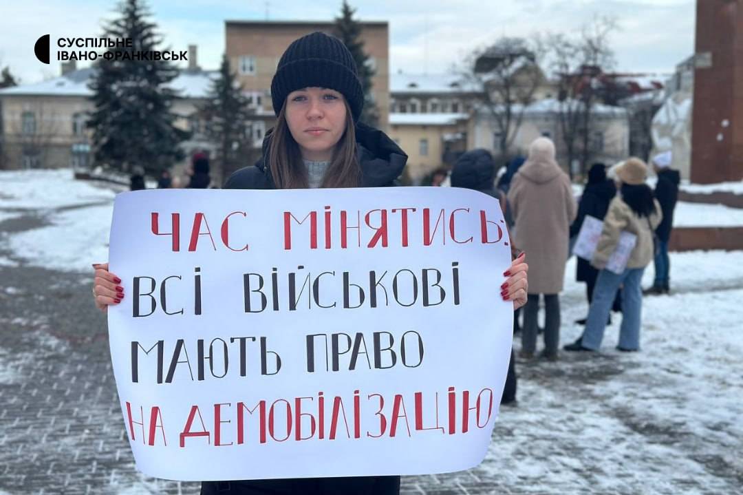 В Івано-Франківську приблизно 60 людей вийшли на мирний пікет за демобілізацію військових після 18 місяців служби. Акція відбулася вп’яте. Розпочалася вона під стінами обласної військової адміністрації. Потім учасники пройшлися вулицями міста.