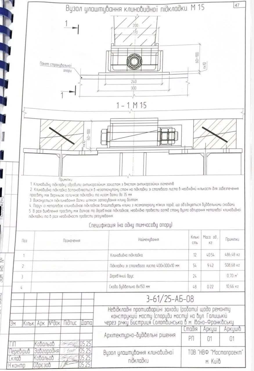Михайло Смушак детально пояснив призначення дерев’яних клинів. Згідно з проєктно-кошторисною документацією, поруч із металевою клиновидною підкладкою влаштовують клини з лісоматеріалу м’яких порід, які об’єднуються будівельними скобами.