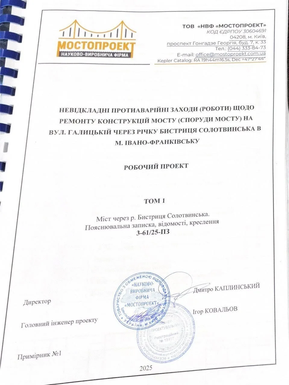 КП «Муніципальна дорожня компанія» провело тендер на виготовлення проєктно-кошторисної документації з експертизою для виконання невідкладних протиаварійних заходів. Переможцем стало ТОВ «Науково-виробнича фірма “Мостопроект”», яке виконало проєкт і експертизу.