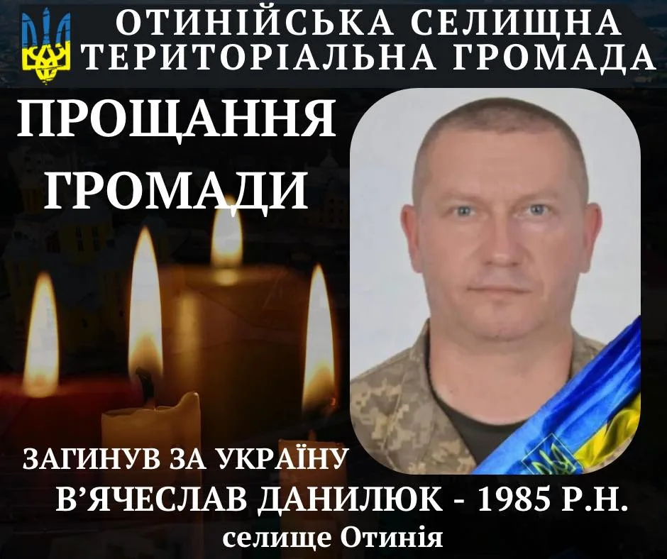 У пʼятницю 17 жовтня о 12:00 на центральній площі селища Отинія (зі сторони м. ІВАНО-ФРАНКІВСЬК) відбудеться прощання громади із загиблим військовослужбовцем Вʼячеславом ДАНИЛЮКОМ — 1985 року народження, жителем селища Отинія.