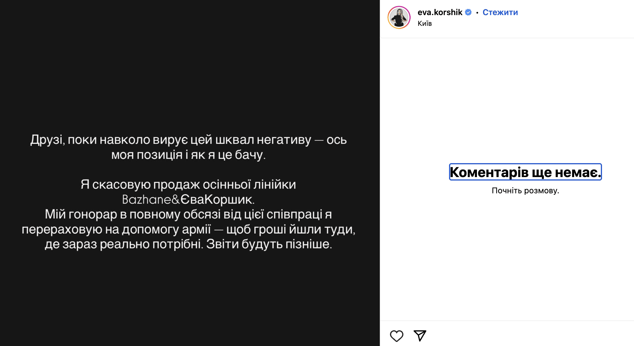 Пізніше стало відомо, що в результаті скандалу співпраця бренду та Єви Коршик була розірвана. Блогерка додала, що весь свій гонорар від колаборації перерахує на потреби ЗСУ.
