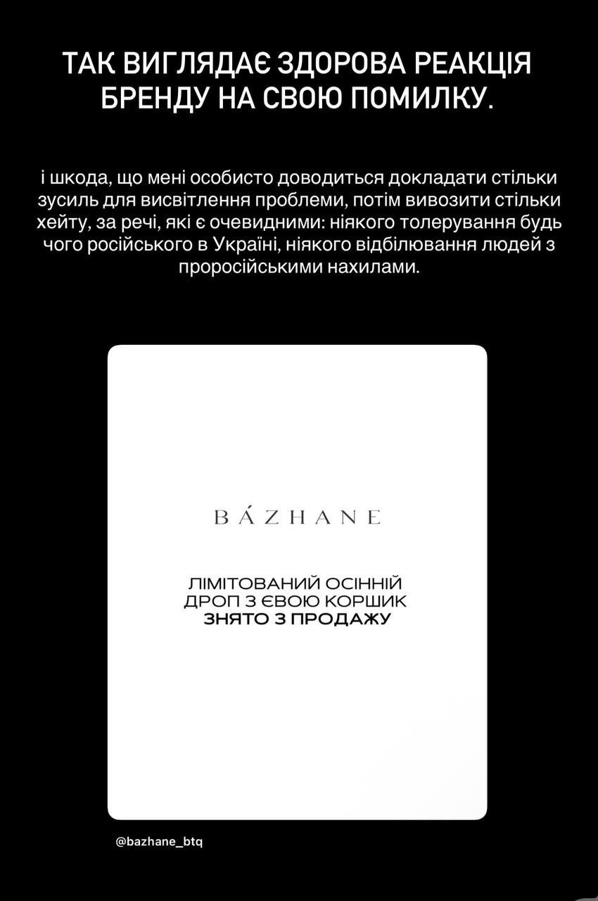 До дискусії приєдналася скандальна блогерка Олена Мандзюк, зазначивши, що українські бренди часто обирають для співпраці інфлюенсерів без чіткої громадянської позиції. У своїх Instagram-сториз знаменитість підкреслила правильні дії компанії та наголосила на важливості висвітлення проблемних ситуацій: “Ніякого толерування будь-чого російського в Україні та відбілювання людей з проросійськими нахилами”.