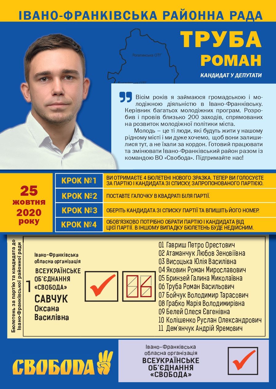 Роман Труба балотувався до Івано-Франківської районної ради на 5 окрузі, був 6 номером у списку всеукраїнського об’єднання «Свобода».