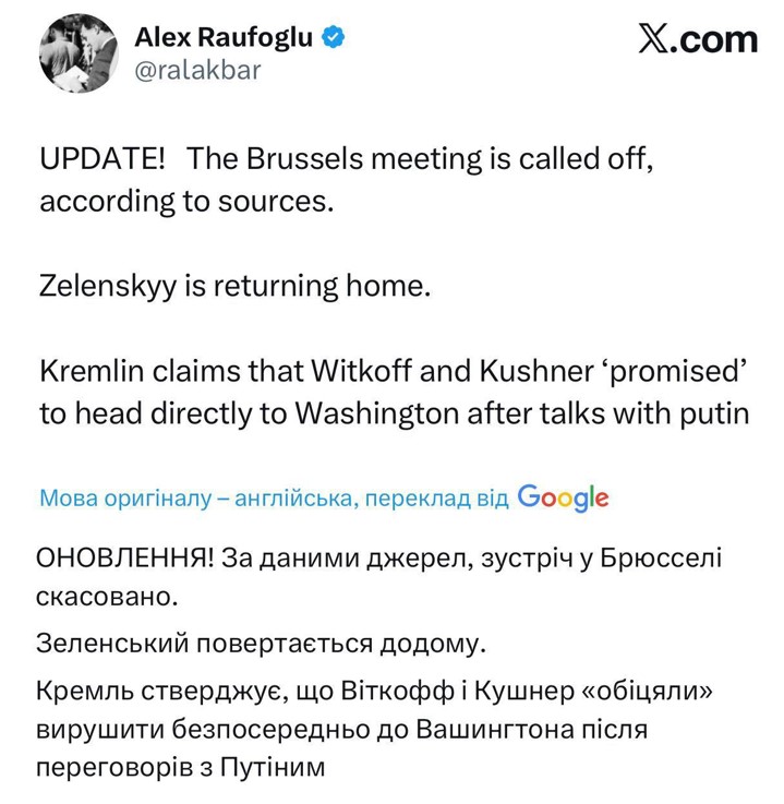 Після цих перемовин, численні джерела стверджували, що Віткофф з Кушнером мали зустрітися з президентом України Володимиром Зеленським у Брюсселі. Водночас в Офісу президента України такі плани заперечили. У підсумку американські переговорники, не розголошуючи деталей, повезли «вимоги» Путіна до Вашингтона.