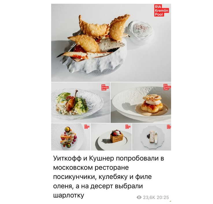 …А прийом Путін влаштував американським гостям розкішний. До того, як почати безпосередньо переговори, високих гостей спершу повели обідати у розкішний московський ресторан. Як пишуть російські пропагандисти, годували гостей з США кулєбяками, філе оленя та посікунчиками (маленькі пиріжки з м’ясом) та шарлоткою.