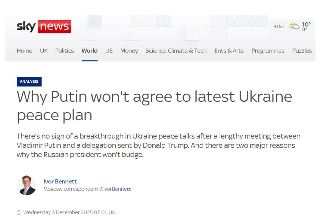 Sky News: «Чому Путін не погоджується на мирний план для України»