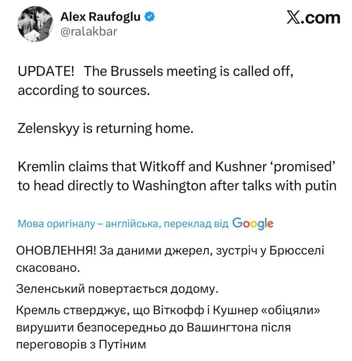 Скріншот Х журналіста Алекса Рафоглу, який анонсував, а потім і «скасував» зустріч Зеленського з Віткоффом і Кушнером