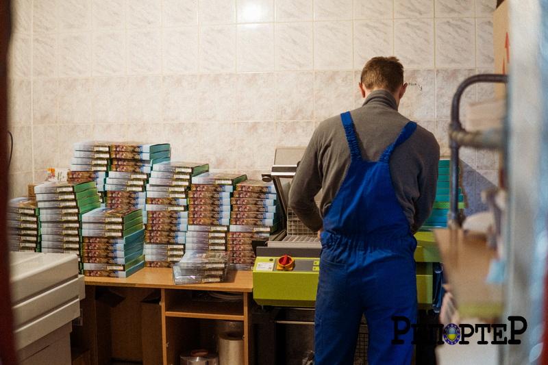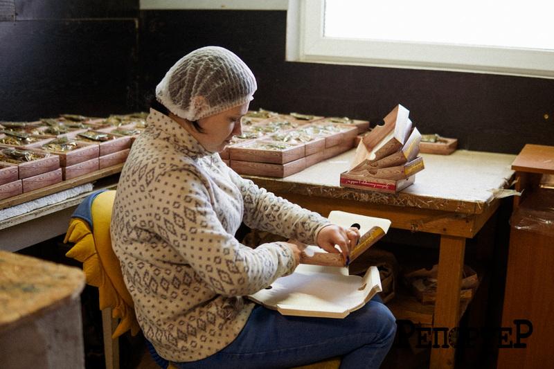 Звідси напівфабрикат у вигляді пакетиків переходить у дбайливі жіночі руки пані Олі. Вона рахує та складає їх у паперові пакети. Від неї все наскладене йде у фасувально-пакувальний відділ, де ще дві жінки перетворюють його у готовий продукт.