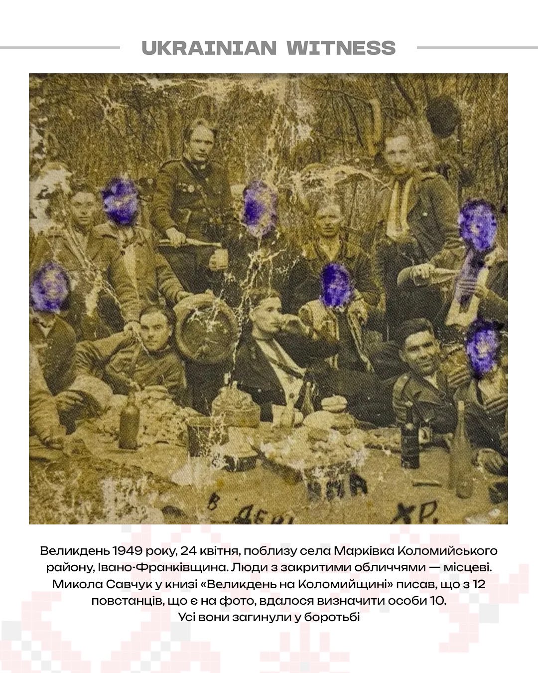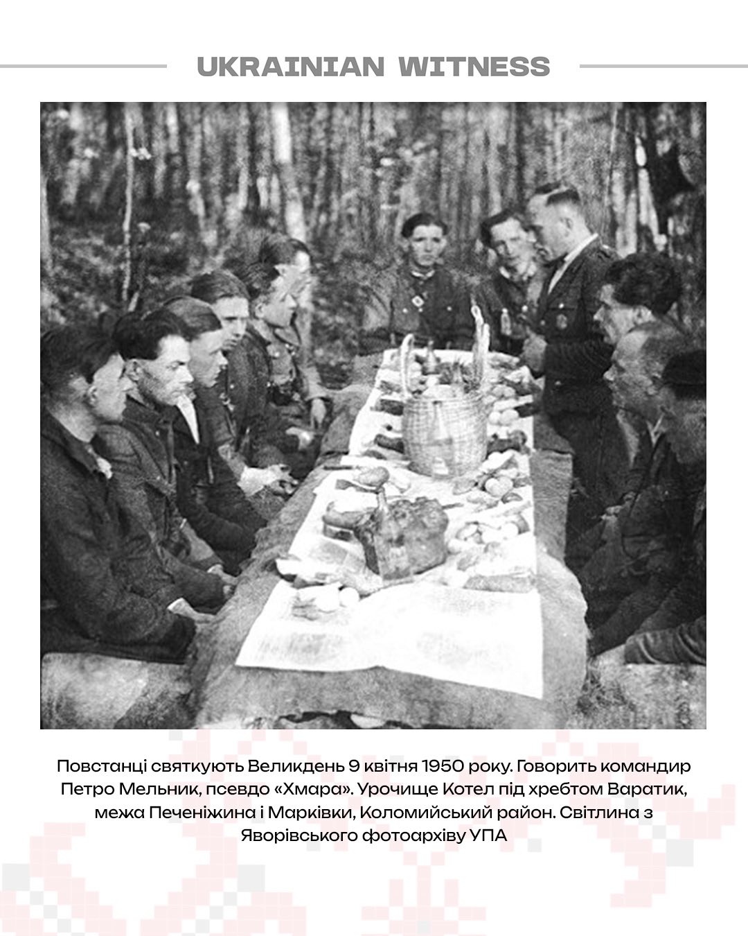 «Святкування Великодня в підпіллі УПА (1944–1950 рр.) було поєднанням суворої військової дисципліни, релігійних традицій та національного піднесення. У лісових таборах в Карпатах, повстанці прикрашали колиби хвойними гілками, облаштовували польові каплиці, ділили освячені паски. Люди з навколишніх сіл приносили паски, ковбаси та яйця. Попри військові умови, повстанці намагалися дотримуватися традицій, ділячись їжею, як одна велика родина», — йдеться в описі до архіву.
