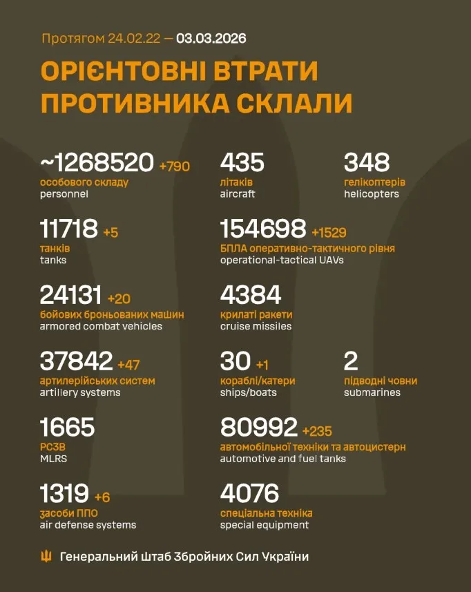 Як повідомляє Генеральний штаб Збройних Сил України, загальні бойові втрати противника з 24.02.22 по 03.03.26 орієнтовно склали / The estimated total combat losses of the enemy from 24.02.22 to 03.03.26: